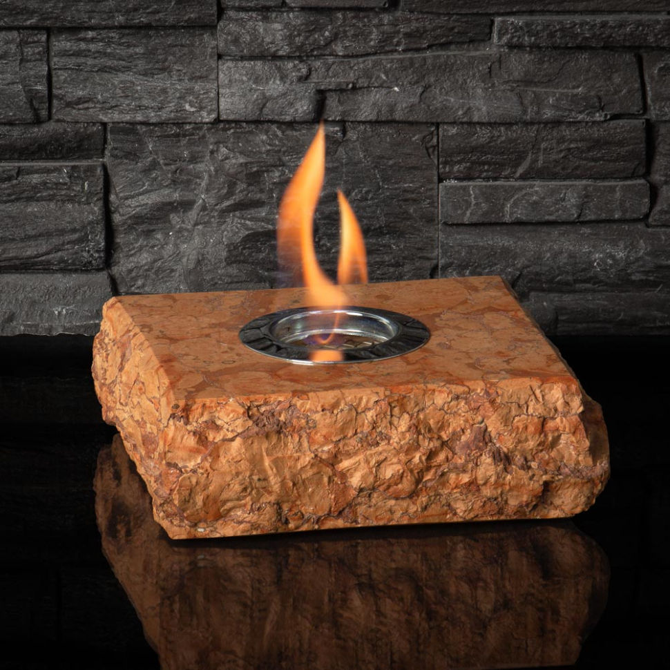 Настольный биокамин управляется вручную. Основой корпуса является натуральный камень. Длина линии огня — всего 52 мм.